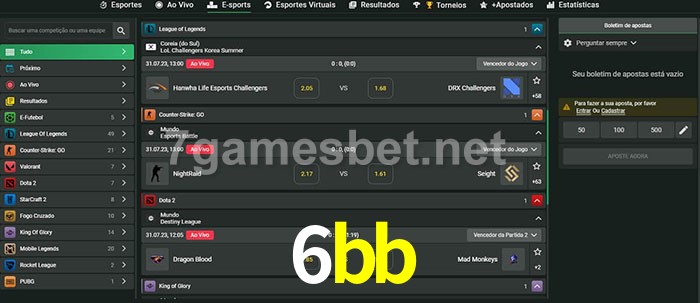 O 6bb oferece uma grande seleção de opções de apostas em e-sports com probabilidades competitivas